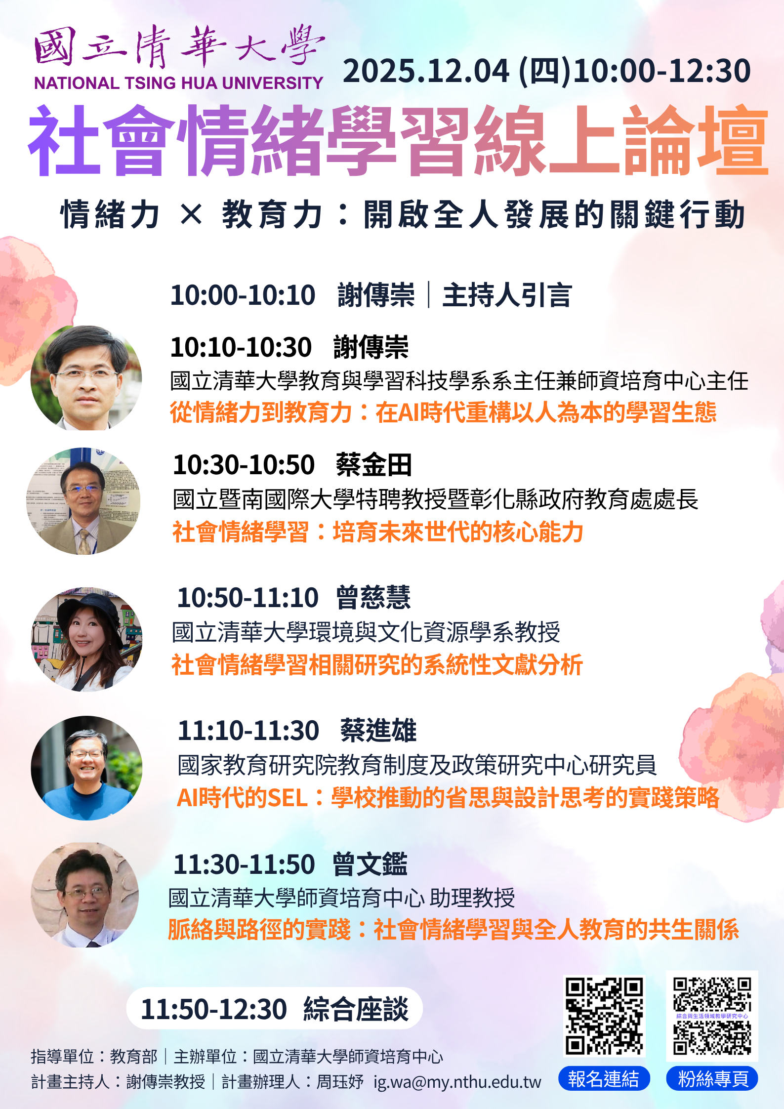 | 二、 | 本次論壇以「社會情緒學習線上論壇-情緒力 × 教育力:開啟全人發展的關鍵行動」為主題,本論壇聚焦於社會情緒學習在教育領域的應用與發展,探討如何透過提升情緒能力,促進學習者在AI時代的全人發展,並分享相關研究成果與實踐策略,為教育工作者提供具體的行動方案與啟發。 |