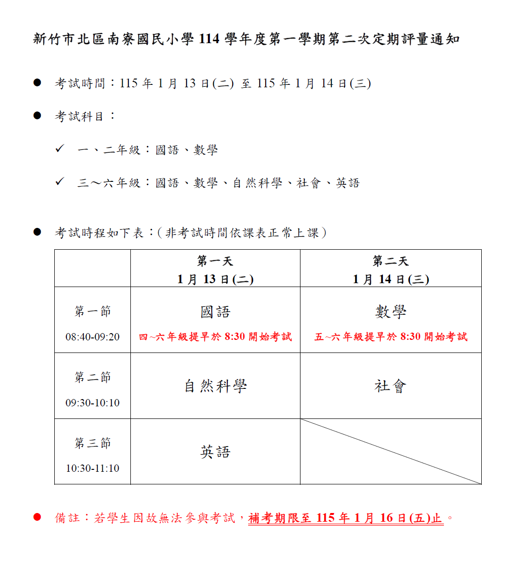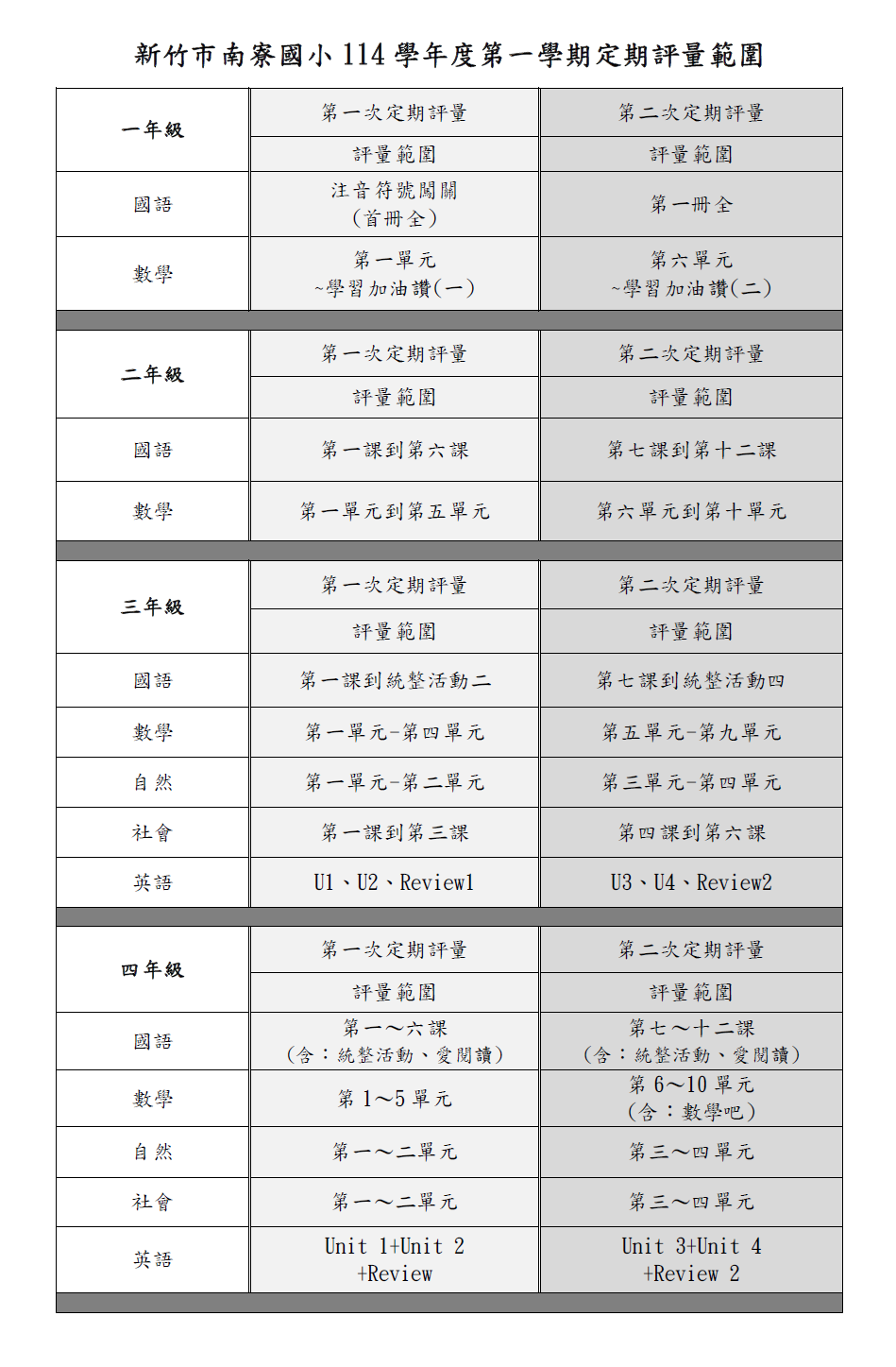 南寮國小114學年度第一學期第二次定期評量通知及考試範圍如附件,