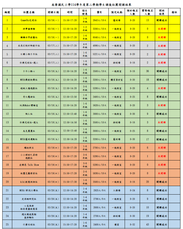 各位家長您好:本訊息為114學年度第2學期社團開課結果公告