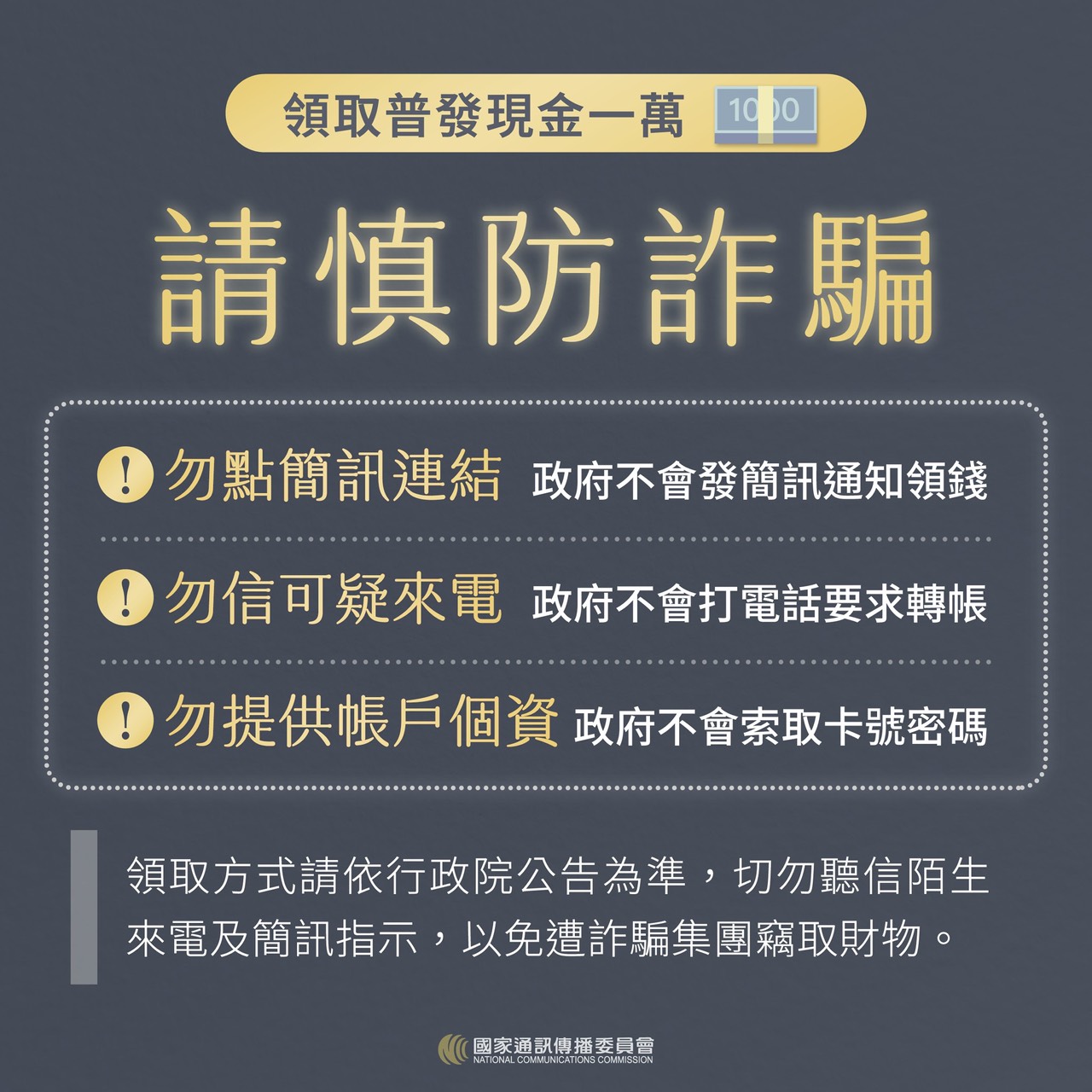 轉知:財政部「全民+1 政府相挺」普發現金網站已經上線(網址:https://10000.gov.tw/ ) ,政府「不會」主動發簡訊或電子郵件通知領錢或登錄,也「不會」電話要求到ATM或網銀操作轉帳;如遇可疑網站或訊息,請立即撥打165反詐騙專線。
