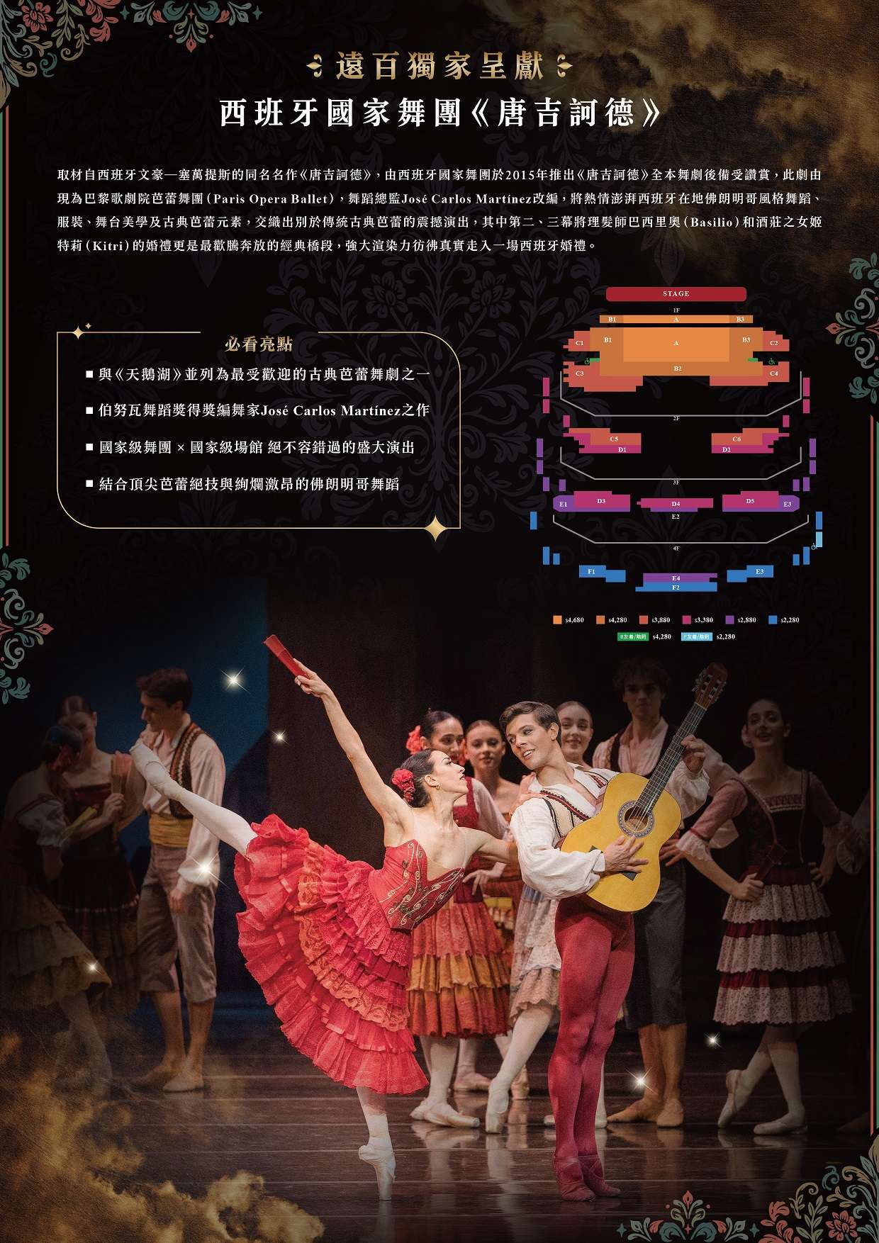| (五) | 本次演出版本由現任巴黎歌劇院芭蕾舞團舞蹈總監、伯努瓦舞蹈獎(Benois de la Danse)得主 José Carlos Martínez 改編創作。Martínez 以19世紀「古典芭蕾之父」莫里斯.佩蒂帕(Marius Petipa)的經典版本為基礎,在尊重古典技術體系與結構框架的前提下,融入更鮮明的西班牙文化元素,使人物性格更加立體,並透過舞段節奏與場景轉換的流動設計,讓敘事更為緊湊而富層次。 |